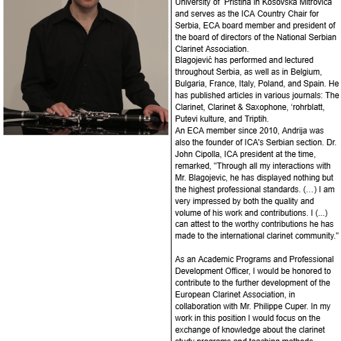 На скупштини међународне организације European Clarinet Association, одржаној у недељу, 30. новембра 2025. године, професор кларинета на Факултету уметности у Косовској Митровици, Андрија Благојевић, изабран је за члана Борда директора, задуженог за академске програме и професионални развој.