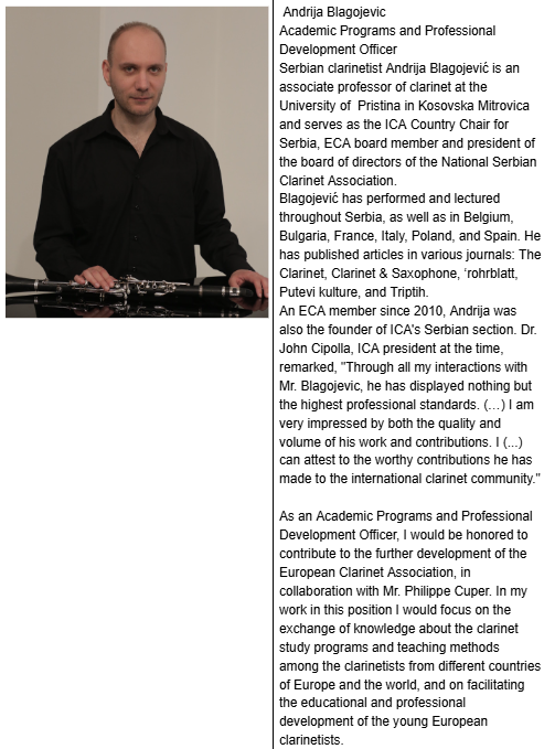 У јесен 2023. започела је реформа ECA. Дана 7. децембра 2023. године, европски кларинетисти окупљени на конгресу у Холандији, изгласали су ново, подмлађено, руководство и структуру ЕСА. Асоцијацијом je руководило двоје копредседника: португалска кларинетисткиња и бас кларинетисткиња Filipa Nunes и немачки кларинетиста Nicolai Pfeffer. Том приликом, формиран је и нови Борд директора, у чије је чланство поново изабран Андрија Благојевић.